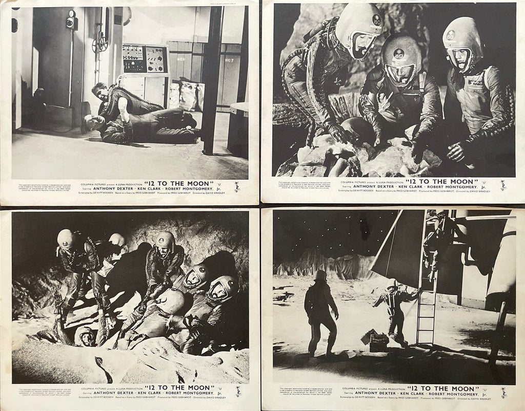 Original UK Front of House Still Set of 8 Stills for the 1960 David Bradley science fiction space exploration thriller - "Land on the moon with the intrepid first astronauts!"; "Land on the moon with the first intrepid astronauts!"; "Starring An International Cast"; "Story by Fred Gebhardt"