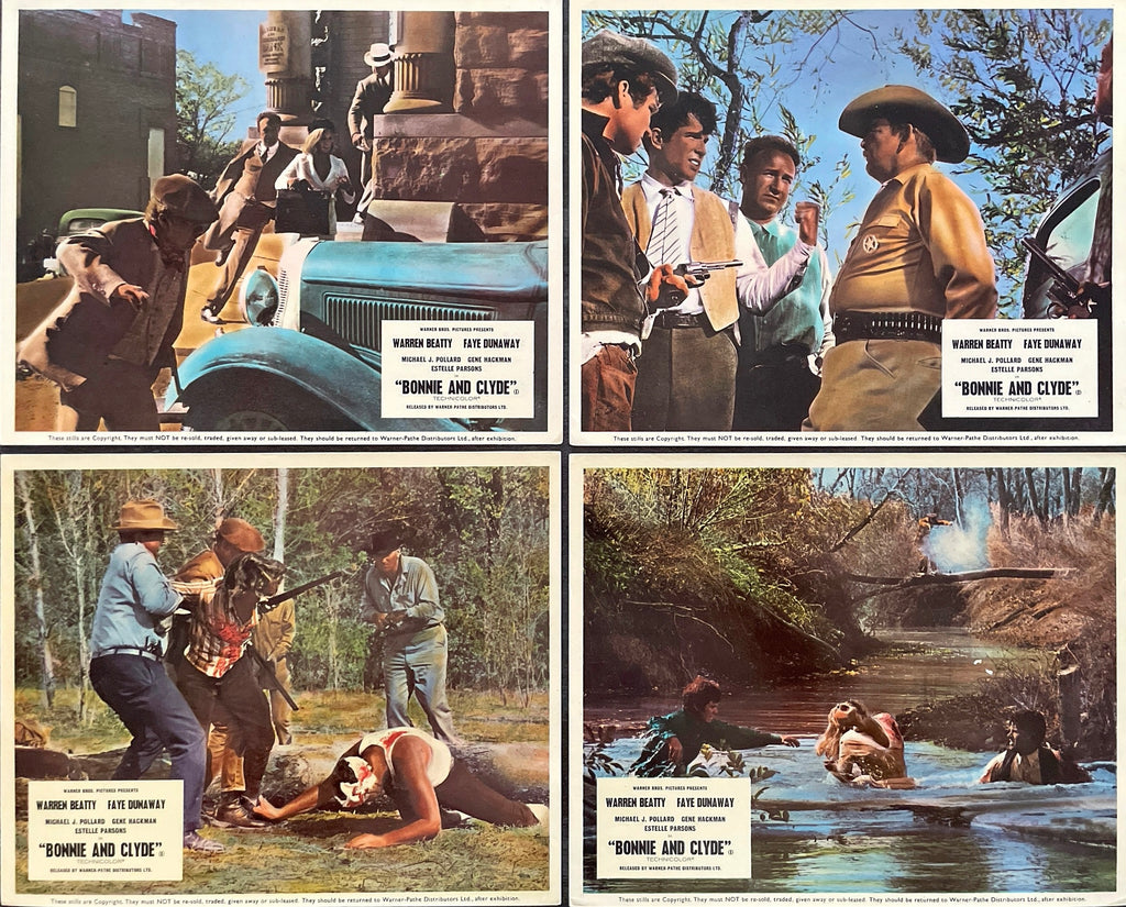 An original UK Front of House Still Set of 8 Stills for the the classic 1967 Arthur Penn (nominated for the Best Director Academy Award for this film) romantic action gangster crime biography - "They're young... They're in love ...and they kill people."; "They met in 1930. She was stark naked, yelling at him out the window while he tried to steal her mother's car. In a matter of minutes they robbed a store, fired a few shots and then stole somebody else's car. At that point, they had not yet been introduced."; "Written by David Newman and Robert Benton. "Clyde was the leader. Bonnie wrote poetry. C.W. was a Myrna Loy fan who had a bluebird tattooed on his chest. Buck told corny jokes and carried a Kodak. Blanche was a preacher's daughter who kept her fingers in her ears during the gunfights. They played checkers and photographed each other incessantly. On Sunday nights, they listened to Eddie Cantor on the radio. All in all, they killed 18 people. They were the strangest damned gang you ever heard of."; nominated for the Best Picture Academy Award; based on the real life exploits of Bonnie & Clyde.