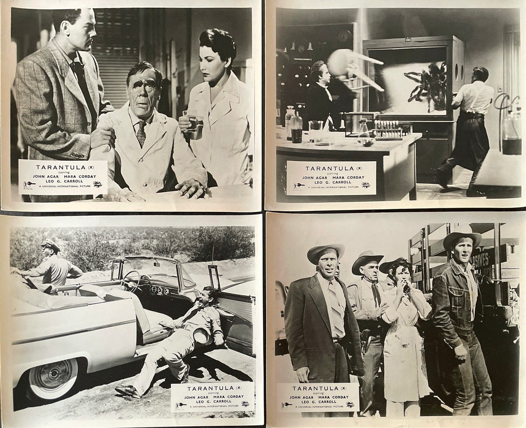 Original UK Front of House Set of 8 Stills for the 1955 Jack Arnold Universal giant spider science fiction fantasy monster horror thriller - "Monster Spider... Crawling terror 100 feet high!"; "Researchers seeking clue!"; "Can anything escape it?"; "Giant spider... deadly accident of science! ...and every second it grows bigger!"; "Towering over cities! Even dynamite can't stop it! Thousands flee its terror!"; "Monster spider 100 feet high!"; "Giant spider strikes! ...crawling terror 100 feet high!"; "Flee city in panic! 100 foot monster spider in attack! Dynamite fails to halt creature!"; "The terror of its dread embrace... the awesome evil of its venom-dripping jaws... threatens all mankind!"